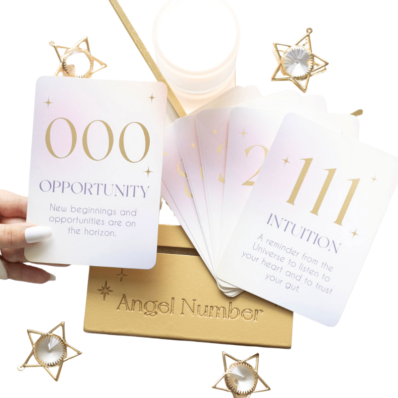 Angel Number bekræftelseskort med træstander